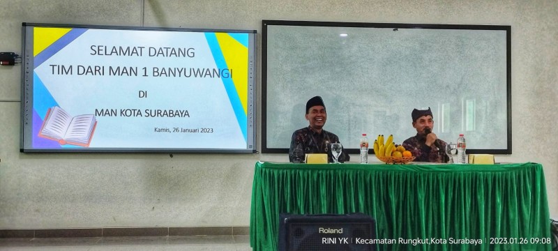Kamis, 26 Januari 2023 pukul 08.30 tim MAN 1 Banyuwangi sejumlah 15 orang diterima oleh Kepala MAN 1 Kota Surabaya, Drs. H Fathur Rohman, M.Pd.I dalam rangkaian kegiatan studi banding program SKS dan IKM yang telah dilaksanakan MAN 1 Surabaya selama ini.
