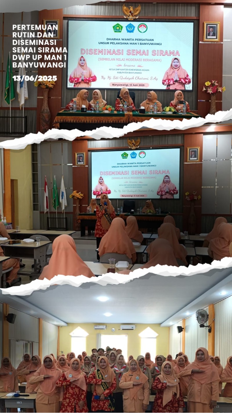 Pertemuan rutin Dharma Wanita Persatuan Unsur Pelaksana MAN 1 Banyuwangi pada Jumat, 13 Juni 2025 disemarakkan dengan Diseminasi Semai Sirama (Sembilan Nilai Moderasi Beragama) oleh Ketua DWP UP MAN 1 Banyuwangi. Bertempat di ruang meeting madrasah, kegiatan ini diikuti oleh anggota DWP Murni maupun Guru. Sebelum dimulai, acara dibuka dengan menyanyikan lagu Indonesia Raya dan Mars Dharma Wanita Persatuan yang dipimpin oleh Ny May Widyastuti, S. Pd. dilanjutkan dengan pembacaan Sholawat Naria yang dipandu oleh Ny. Ulya Hafidzoh, S. Pd. I. dan pembacaan doa yang dipimpin oleh Ny. Yunia Rohmah, S. Ag.