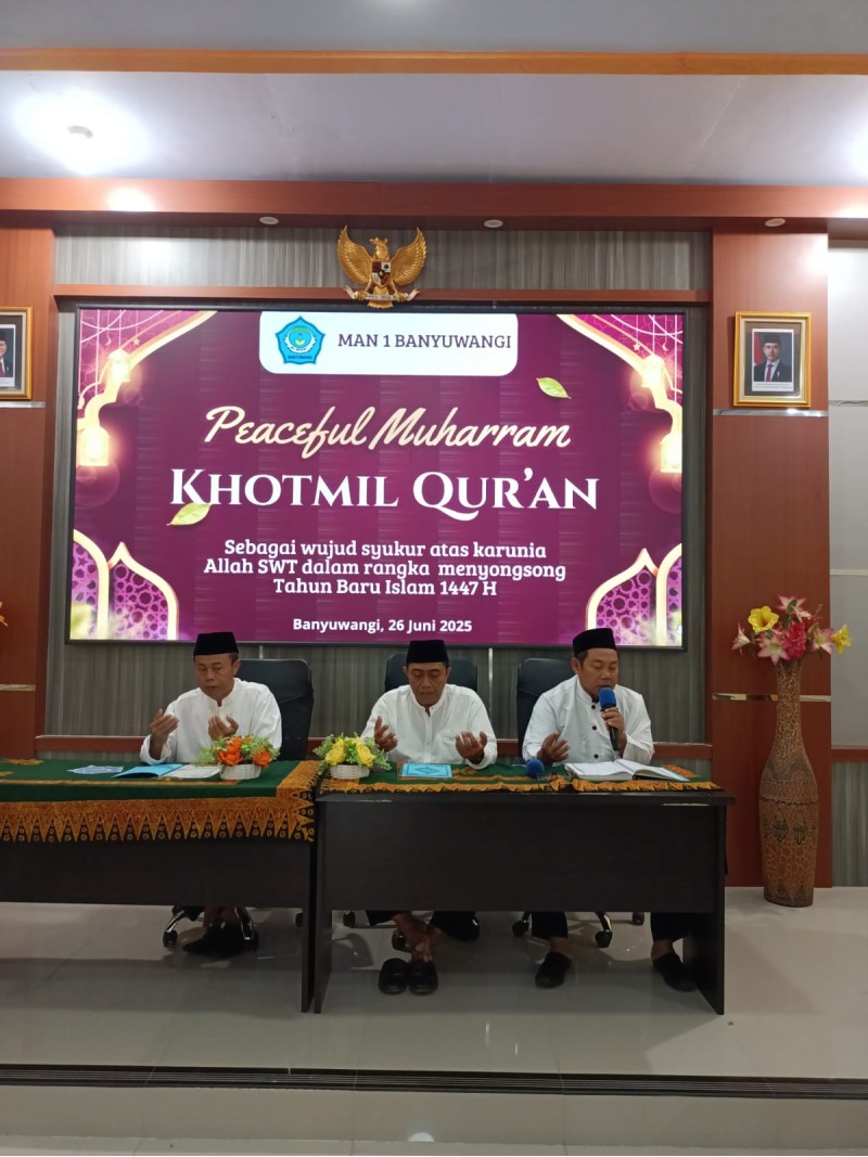 Humas MAN 1 Banyuwangi -- Alunan pembacaan kitab suci Al qur'an terdengar lembut dan syahdu mengiringi matahari pagi yang terasa terbit malu-malu. Di MAN 1 Banyuwangi pada Kamis, 26 Juni 2025 diadakan Khotmil Qur'an dengan dihadiri oleh kepala madrasah serta pendidik dan tenaga kependidikan bertempat di ruang meeting MAN 1 Banyuwangi. Kegiatan Peaceful Muharram yang diprakarsai oleh kementerian Agama Kabupaten Banyuwangi untuk menyambut datangnya tahun baru Islam 1447 H.