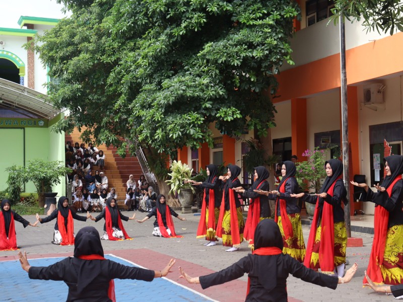 Seusai upacara Hari Pahlawan di halaman Madrasah Aliyah Negeri (MAN) 1 Banyuwangi, suasana yang semula khidmat tiba-tiba berubah menjadi hangat dan penuh warna. Iringan gamelan menggema, selendang merah berayun, dan senyum para penari menebar semangat baru.