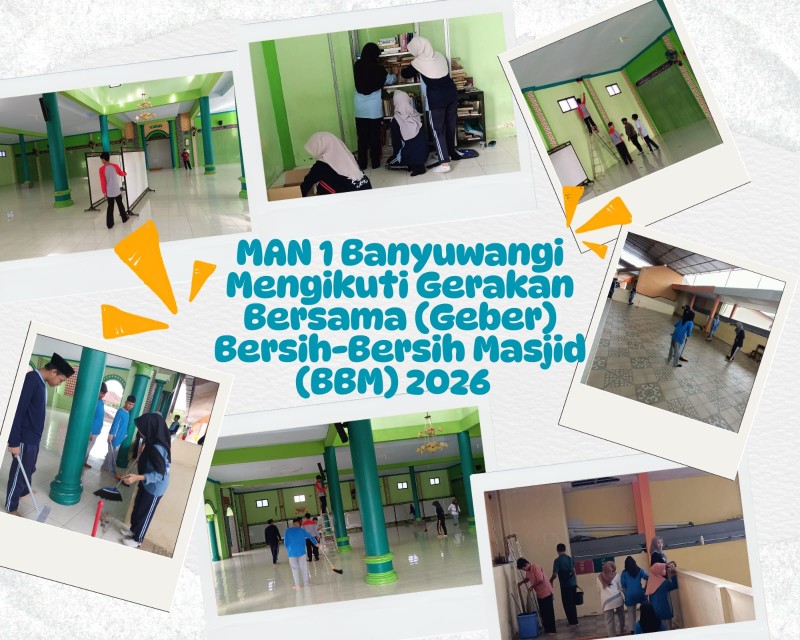 Humas MAN 1 Banyuwangi – Mematuhi surat edaran dari Kantor Kementerian Agama Kabupaten Banyuwangi, MAN 1 Banyuwangi menggelar aksi bersih-bersih masjid secara serentak pada Senin (16/02/2026) pagi. Kegiatan yang berlangsung dari pukul 07.00 hingga 10.00 WIB ini merupakan bagian dari program nasional Gerakan Bersama Bersih-Bersih Masjid (Geber BBM) 2026 yang diinisiasi oleh Kementerian Agama RI.